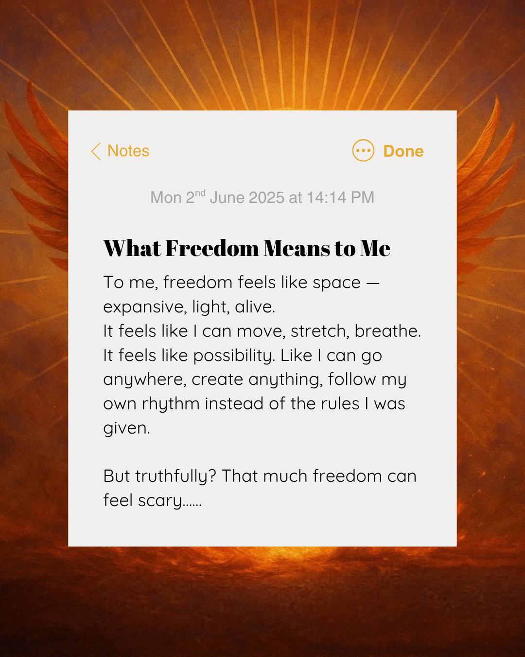 It feels like possibility. Like I can go anywhere, create anything, follow my own rhythm instead of the rules I was given.